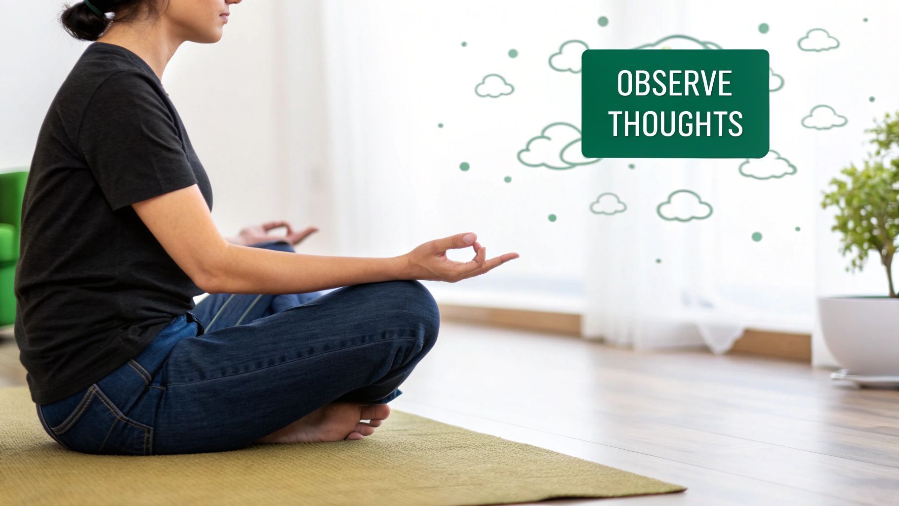 • Acknowledge thoughts as they come. When a thought inevitably appears, simply label it in your mind as "thinking" and gently guide your focus right back to your breath.